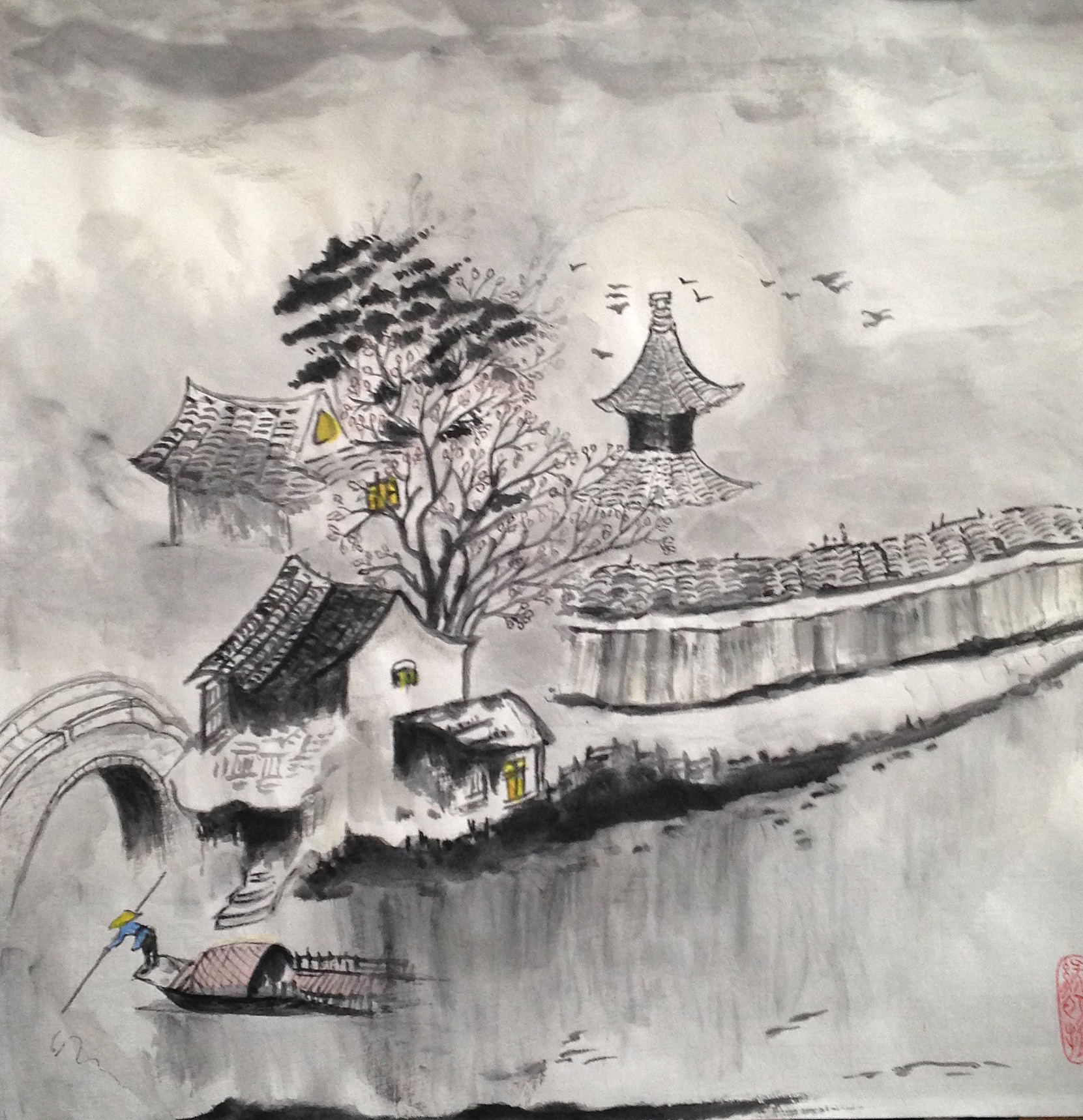 В китайском пейзаже должна быть гармония небесного светлого — символ Ян и черного Инь земля. Примерно одинаковое количество черного и белого — это признак качественной китайской картины.